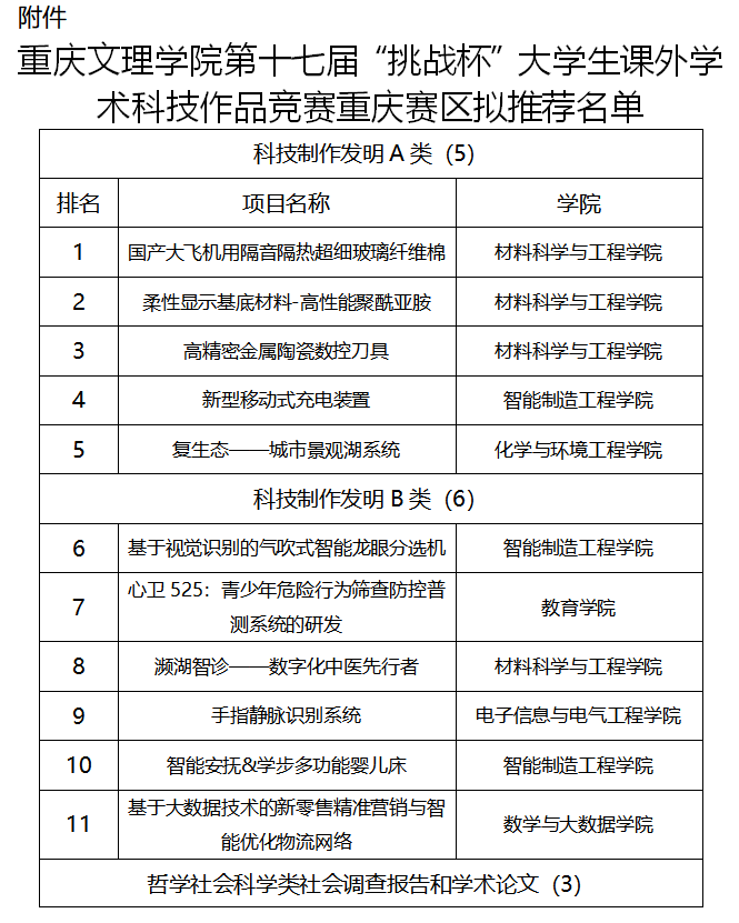 根据《报送第十七届“挑战杯”全国大学生课外学术科技作品竞赛重庆赛参赛作品的预通知》《伟德国际victor1946举办第十七届“挑战杯”全国大学生课外学术科技作品竞赛校内选拔赛的通知》要求,经组织校外专家评审遴选,现对“国产大飞机用隔音隔热超细玻璃纤维棉”等17个拟推荐市赛项目予以公示(排名顺序不分先后),公示期5天(2021年4月9日至4月14日),公示期间如有异议请向校团委办公室(联系电话:49891962)反映。