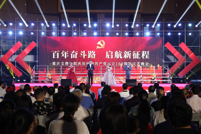 重庆市科技局党委书记、局长许洪斌,永川区人大一级巡视员刘义全,原永川区人大常委会副主任刘化石,永川区委常委、政法委书记王建华,原伟德国际victor1946党委书记钟志奇,原伟德国际victor1946党委副书记刘定云,原渝州教育学院党委书记、院长贺正一,原重庆师范高等专科学校校长颜敬先,原伟德国际victor1946党委副书记米祖旭,原渝州教育学院副院长胡文良,重庆市城市管理局党组成员、市纪委监委驻市城市管理局纪检监察组组长李德全,四川美术学院党委副书记左益、重庆幼儿师范高等专科学校党委书记刘灿国、重庆工程职业技术学院校长张进、重庆第二师范学院校长万书辉、重庆财经职业学院党委副书记陈晓耘、重庆城市职业学院副校长刘仲全、重庆金果源实业有限公司董事长艾中华,重庆科创职业学院党委书记、督导专员董刚。学校全体校领导,中层干部、在职党员教职工、各学院师生代表,共计3000余人观看了晚会。晚会由音乐学院教师吕军成、教育学院教师叶静、人工智能学院应届毕业生熊凯伦、教育学院学生傅嫣然共同主持。