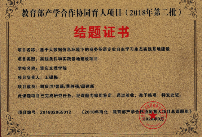 2019年,外国语学院资料室再次成功申报2019年第一批产学合作项目,与北京数通国软公司合作开发“基于三创竞赛及技术培训的学生创新实践”的实践条件和实践基地建设项目,合作期为2年。合作期间,主持人王韫梅老师组织了《跨境电商应用与推广》阅读会、商务英语写作等实践活动,进一步提升了商务英语专业学生读者的阅读量。该项目已于2021年8顺利结题。