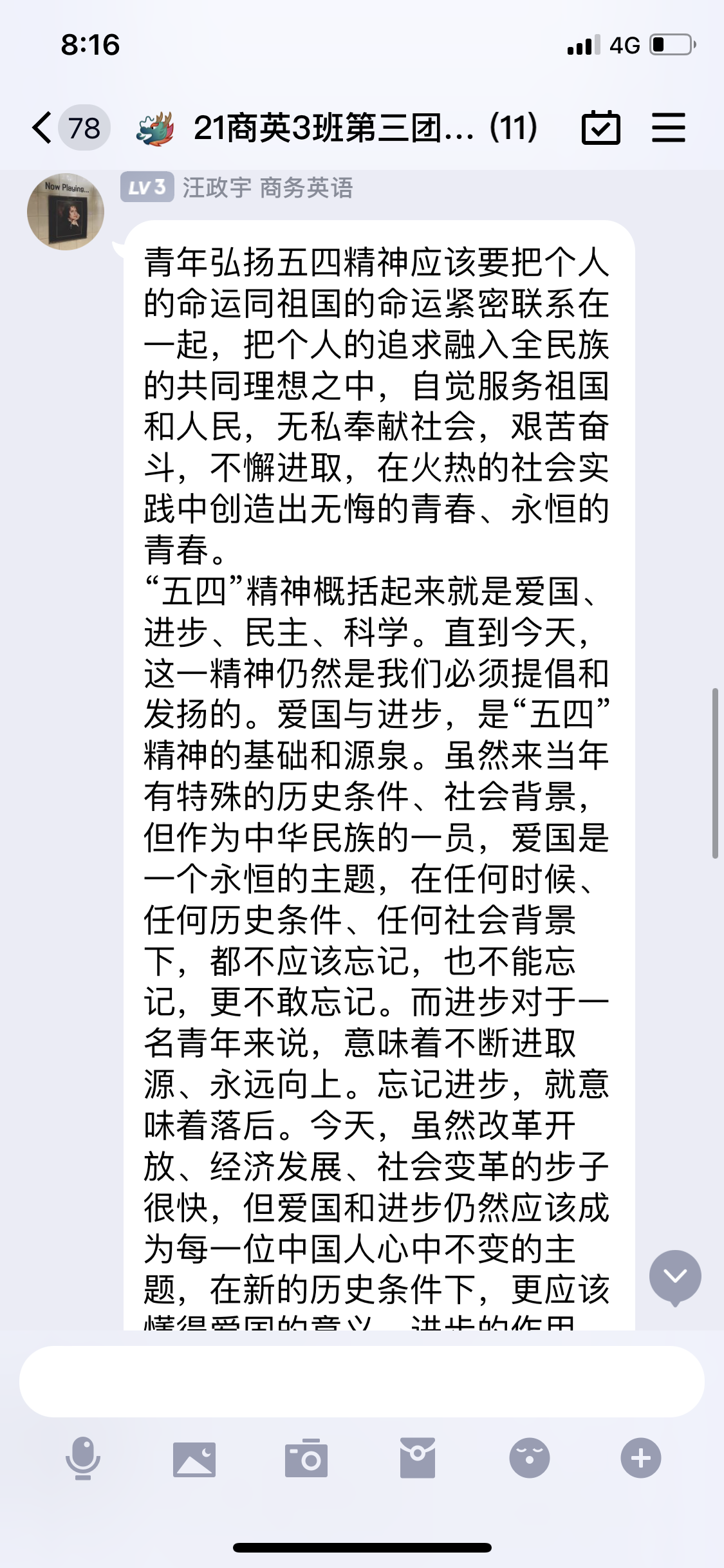 各班级团支部书记以“党史学习教育”以及“党的青年运动史”为主题开展线上微团课,带领青年团员深入学习“新时代党和国家发展的伟大成就”“党领导中国青年运动的光辉历程”,巩固拓展党史学习教育成果。微团课上同学们分享红色故事、传承五四精神,用线上PPT、动画视频、演讲、朗诵、历史人物对话等形式,带动青年团员进一步认识“为什么出发”的初心使命、把握“怎样走到现在”的经验规律、明确“如何走向未来”的目标任务,以青年人独有的热情和活力把握时代旋律,激发基层团组织活力。